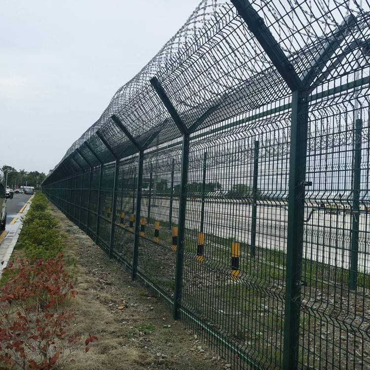 機場護欄網(wǎng)又稱作“Y型安全防御護網(wǎng)”,由Y型支架立拄,加強型焊接網(wǎng),安全防盜連接件和熱鍍鋅刀片刺網(wǎng)組成,是強度和安全防御性級別很高的圍界護欄網(wǎng)產(chǎn)品。采用5.0mm高強度低碳鋼絲焊接,網(wǎng)孔:50mmX100mm,50mmX200mm網(wǎng)片中帶有V型加強筋,可大大增強圍網(wǎng)的抗沖擊力,立柱為60X60的矩形鋼,頂端焊有V型之架,或者采用70mmX100mm的掛式。注:如果在機場護欄網(wǎng)頂部加裝刀片刺絲、刀片刺繩后又很好的增強了安全防護性能。